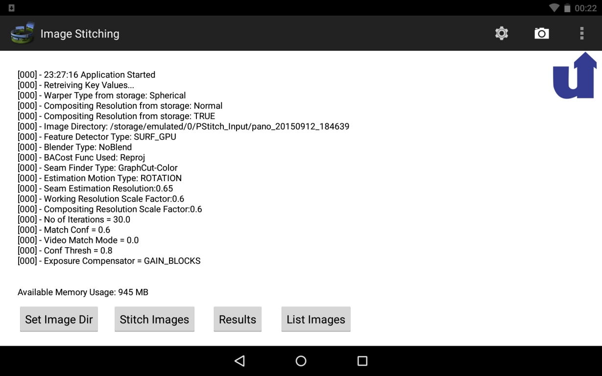 Figure 3 shows the main UI of the Android Application and the figure 4 shows the Preferences Dialog, through which user can select different algorithms for each step involved in the stitching process. All the available settins are shown in the Table 1.