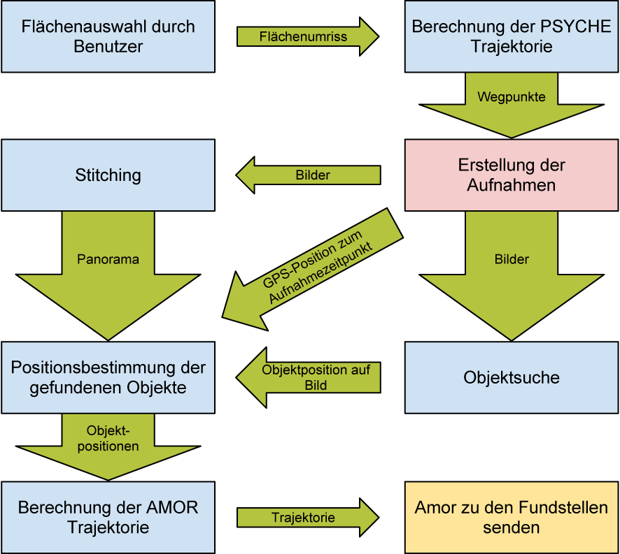 Abbildung 1: Ablauf der Objektlokalisierung. Die blauen Prozesse werden auf der Bodenstation, der rote wird auf der Drohne PSYCHE und der gelbe auf dem Bodenroboter AMOR ausgeführt.