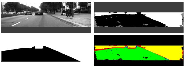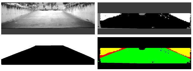 Anschließend erfolgt die Klassifizierung der Szene in befahrbare und nicht befahrbare Bereiche. Dazu wird zuerst eine Initialschätzung vorgenommen. Diese basiert auf den Disparitätswerten des Stereosystems und dem geschätzten Steigungsverlauf der Straße. Alle Pixel werden als straßenzugehörig (schwarz) oder als potentielle Hindernis-, Fahrbahnbegrenzungs- und Umgebungspixel (weiß) markiert. Aufgrund von verrauschten Disparitätswerten befinden sich in der potentiellen Straßenregion noch sehr viele Störwerte, die beseitigt werden müssen, da sonst ständig fehlerhafte Hindernisse in der Fahrspur erkannt werden. Um die Markierung von Straßenpixeln zuverlässiger gestalten zu können, muss bekannt sein, an welchen Stellen im Bild Straßenflächen existieren, weshalb die folgenden Schritte durchgeführt werden.